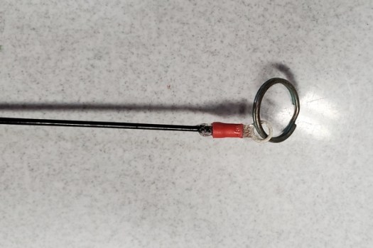 My quick and dirty replacement for the broken eyelet on my Black Widow telescopic pole. I simply glued a ring terminal to the top section of the pole.