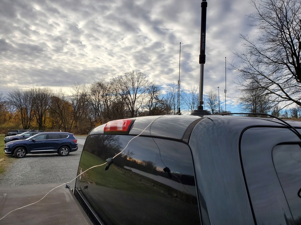 The Gabil GRA-7350TC and magnetic mount with one 33-foot counterpoise attached. The wire dropped to the ground behind the truck and wrapped around the side.