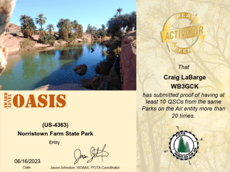 Previous Image Next Image Repeat Offender Award US-4363 POTA Oasis Repeater Offender award for 20 activations at the same park