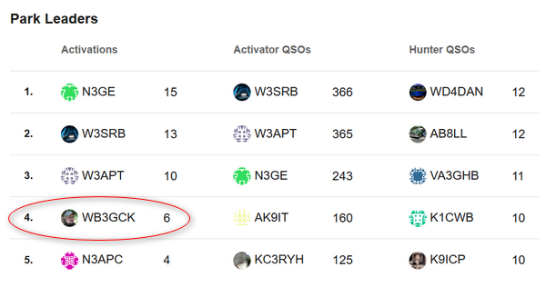 Previous Image Next Image SGL246 Park Leaders How about that! My three activations put me in the Park Leaders list for US-8941. How about that! My three activations put me in the Park Leaders list for US-8941.